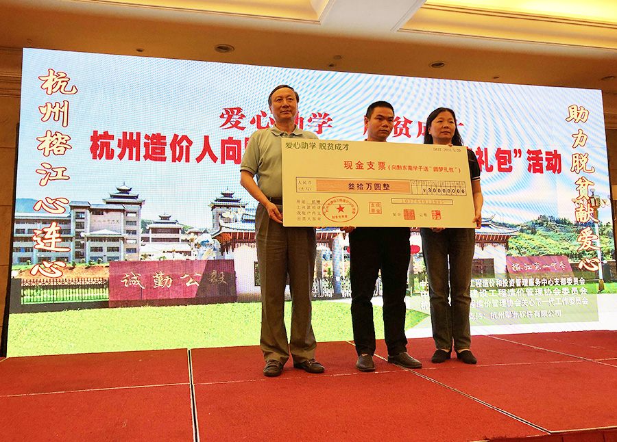 去年7月,杭州市造价咨询企业积极响应杭州市政府“杭州、黔东南”东西部扶贫号召,组织爱心企业代表到黔东南贫困县榕江实地调研考察,与榕江结对帮扶,协会与58家企业向榕江县捐款74.7万元,帮助榕江县188户贫困家庭改善住房条件。目前榕江县249户贫困群众的透风漏雨房已全面改造完成,杭州造价人的爱心善举在贵州榕江已经落地。